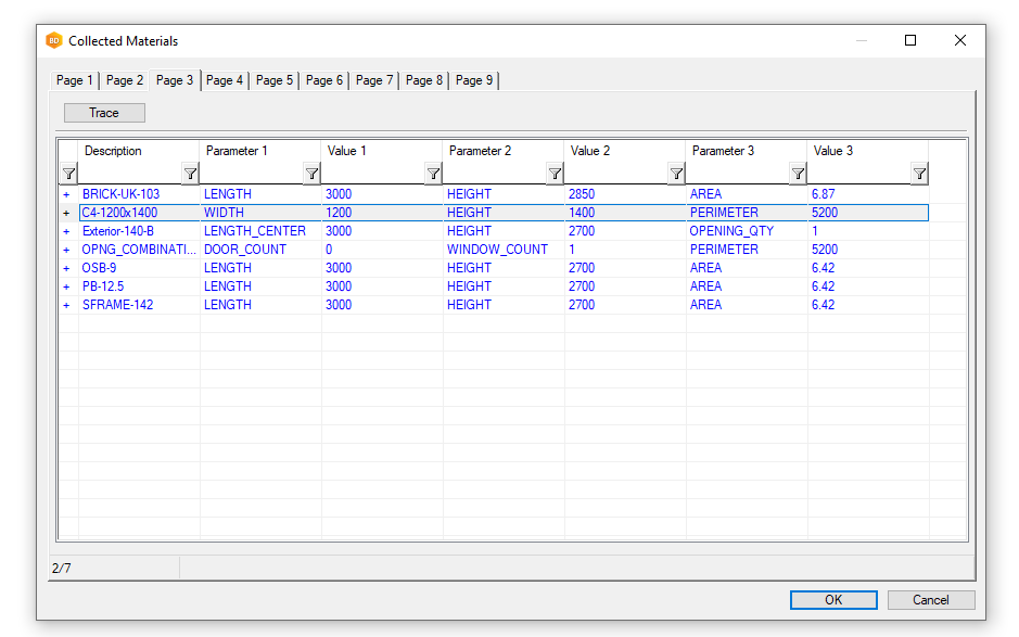 Below we can see windows know their width, height and perimeter, parameters 1, 2 and 3 respectively, whilst walls know their length, height and opening quantity. There can be more collected parameters on further pages.