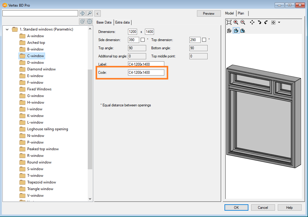 Draw a simple one wall project and add a window to the wall. Here the C window from the European metric version of Vertex BD is used and its code C4-1200x1400 is highlighted.