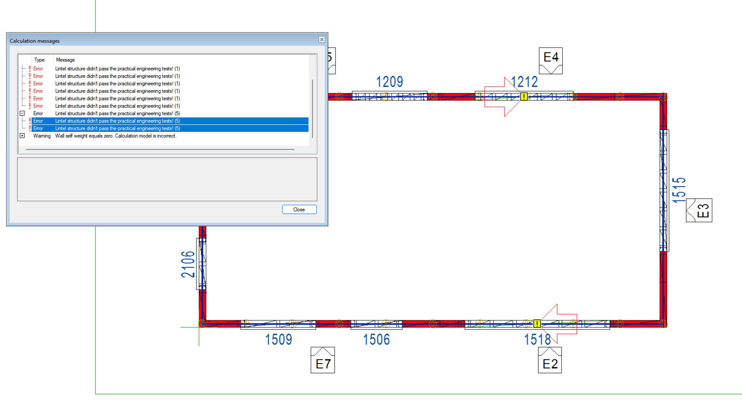 The pieces with this error message did not pass capacity check. Check the result and analyse the reason for failure. Make adjustment and perform wall engineering again. If the system cannot find the structure in the load table, this error message will also appear along with the one above.