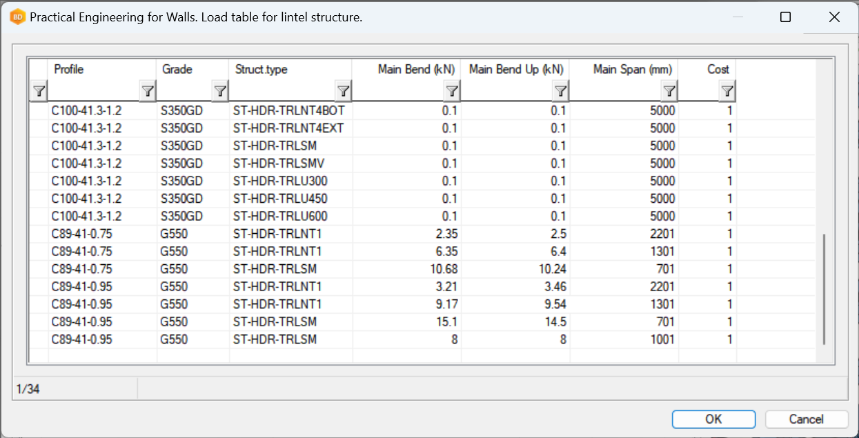 When the exact width of the lintel is not found in the load table, system will select the next larger one to be on the safe side.
