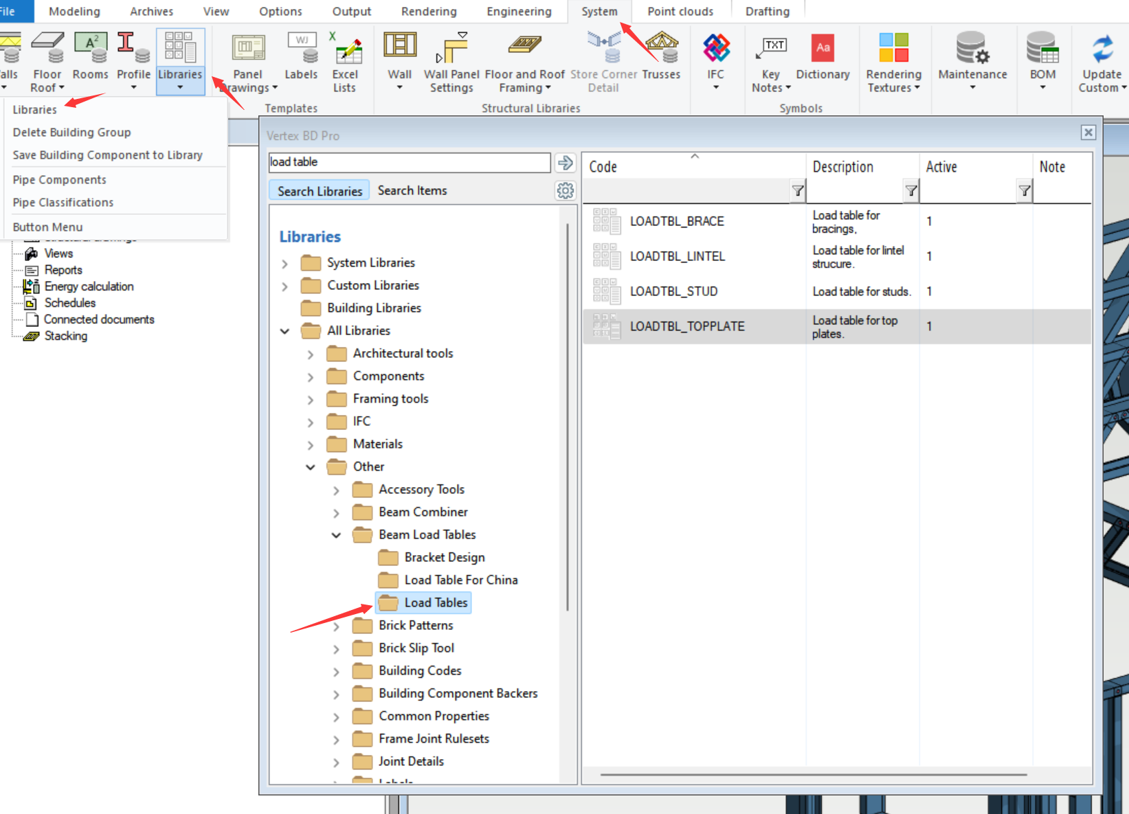 Vertex wall engineering is a table-based design tool aimed at checking the capacity of wall frame components against the vertical loads from the structures above the walls. The capacity check includes headers, studs with/without noggings, and lintels. The unfactored reaction loads from the truss above the wall panels are collected and allocated to the location of the contact. The loads will then be factored and combined. The system will work out the worst case and compare that to the capacities of the components defined in a load table, which can be specified by the engineer.