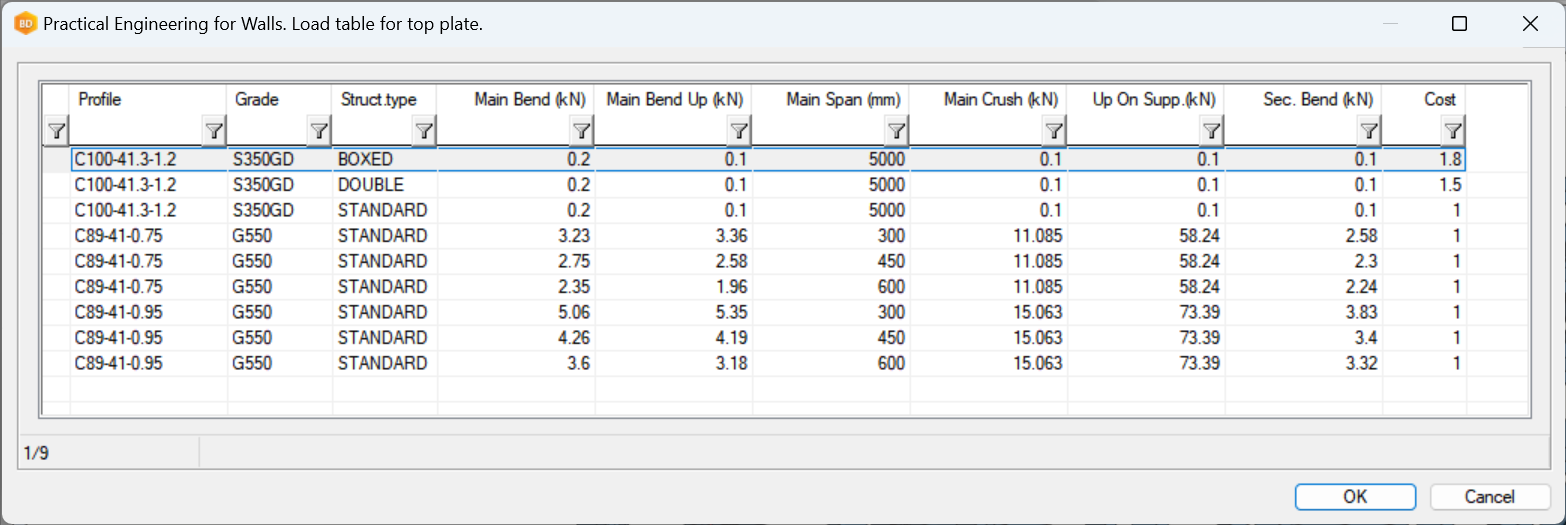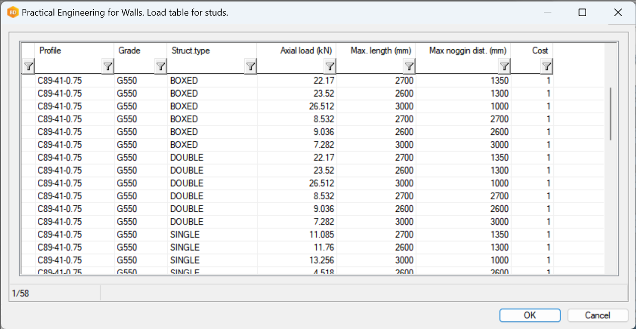 When the exact length for Max. length and Max noggin dist. is not found in the load table, system will select the next larger one to be on the safe side.