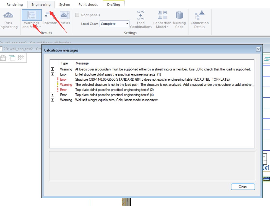 After performing wall engineering, a calculation message with warnings and errors would appear. You can also find it later in Warnings and Errors under the Engineering ribbon. You can identify the pieces causing the errors in both 2D and 3D model pairs, making troubleshooting much easier. In this section, some of the most often seen warnings and errors are explained.