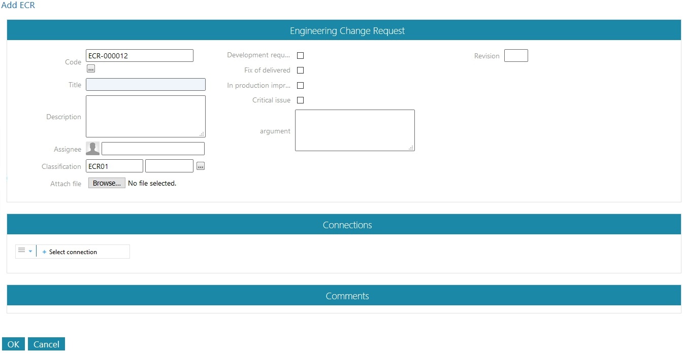 There opens an Add ECR -page. Already in the creating state you should connect the ECR to the object it is related to. After adding the connection, add the basic information, like title and classification (if it wasn't selected earlier). As an assignee select the person who you want to look at the suggestion and comment it. You can attach files that are related to the suggestion. There are different attributes which you can select to describe the suggestion better (fix of delievered, critical issue). The attributes shown in the picture below are the ones that come with Flow's basic delivery.