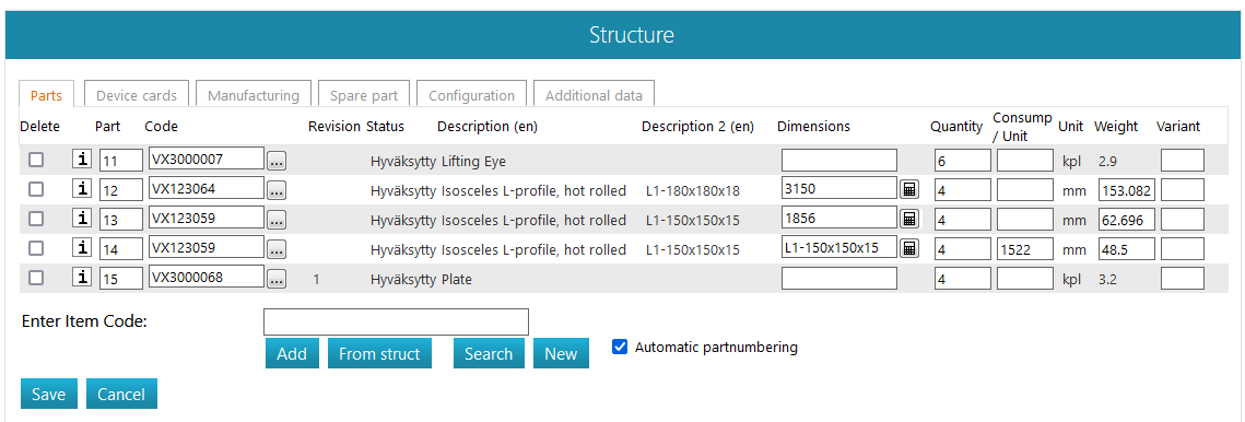In such cases, it is advisable to first calculate the item structure's line-by-line weights and then save them.