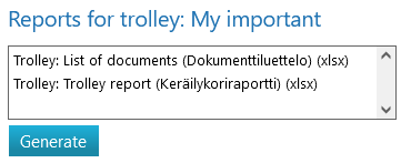 The Reports function is used to create Excel-format (xlsx) listings of selected objects from the trolley.
