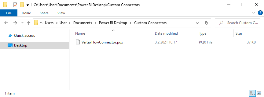 You can download and install the Power BI Desktop reporting software for free from Microsoft's website or the Microsoft Store. To install the Flow connector, locate the installation directory for Power BI connectors, which is typically found at C:\Users<username>\Documents\Power BI Desktop\Custom Connectors. If the directory does not exist, create it. Download the Flow connector file VertexFlowConnector.pqx from the link on the right and move it to the Custom Connectors installation directory. The connector can be enabled in two different ways, depending on the connector's certificate. See the options below:
