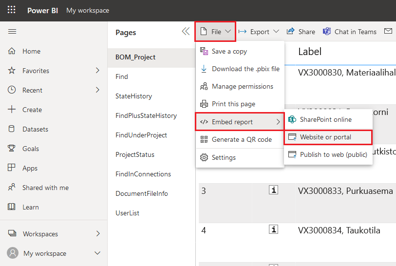 You can also embed the report as an interactive HTML element directly into a webpage or intranet service. Obtain the HTML <iframe> code snippet by opening your report and selecting File > Embed report > Website or portal. Embedded reports can only be viewed by individuals with whom you've shared the report, and viewing the report requires the browser to be signed in to Power BI Service.