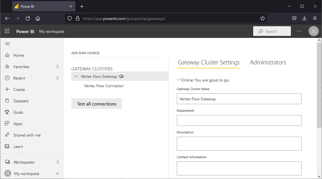 Even if your Flow server is accessible via the public internet (e.g., https://flow.yourcompany.com) and is not strictly a local data source, Microsoft requires that custom connectors such as the Vertex Flow connector use the On-premises Data Gateway when connecting to Power BI Service.