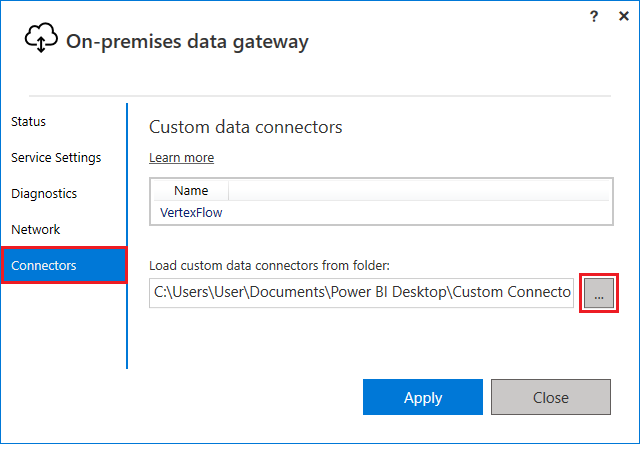 After completing the steps above, open the Connectors tab of the On-premises Data Gateway and select the directory where the Vertex Flow connector is located. The Vertex Flow connector should appear in the list on the Connectors tab.