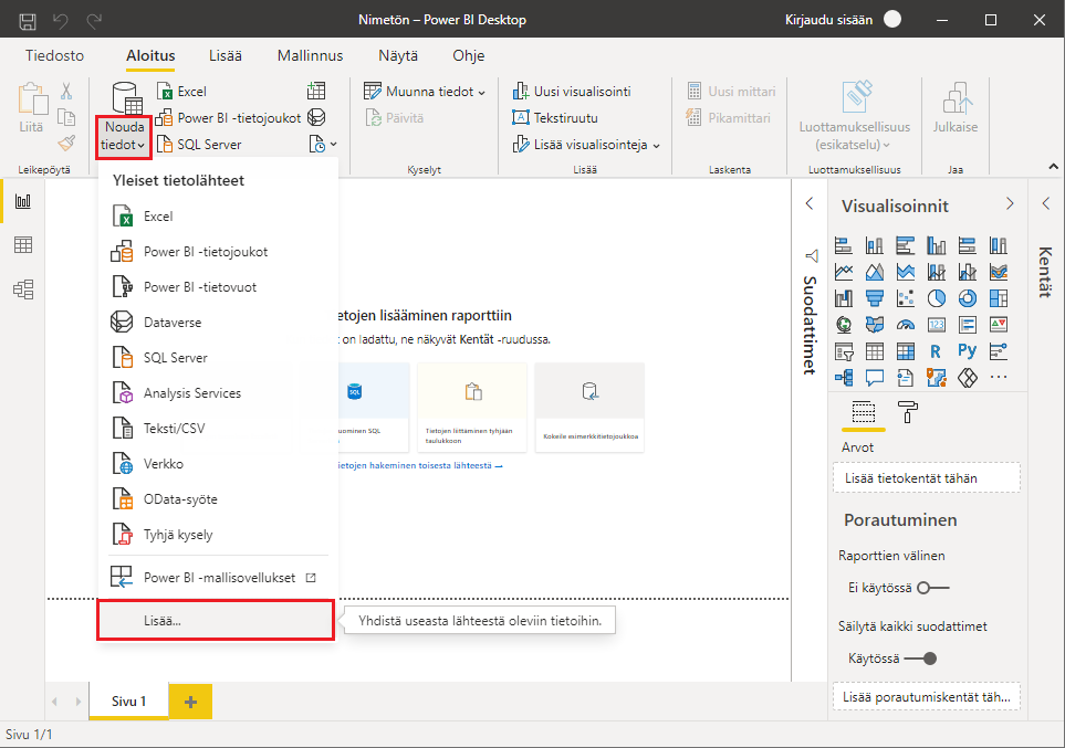 In Power BI, go to the Home tab of the ribbon, select the Get Data function from the Data group, and choose Add from the list...