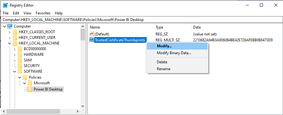 Navigate to the path HKEY_LOCAL_MACHINE\Software\Policies\Microsoft\Power BI Desktop using the Registry Editor tool and create a new "Multi-String Value" (REG_MULTI_SZ) variable named "TrustedCertificateThumbprints" if it does not already exist.
