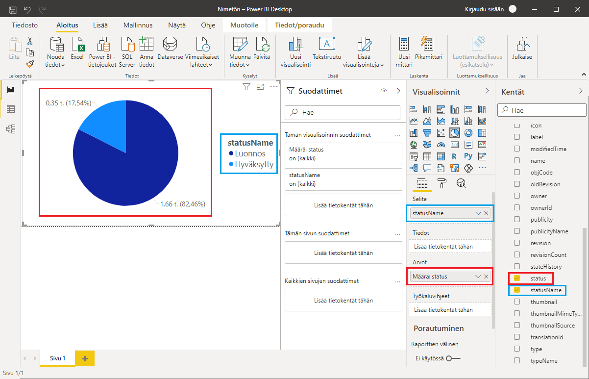 If you wish, you can drag the same column into both the Legend and Values fields. In the example image, the same result could be achieved by using the column statusName in both fields. If the column status were used in both fields, the legend of the pie chart would display the raw data format of the objects' status, which with a customized status model might be just a numeric series. By using a separate column in the Legend field, you can ensure that the legend of the visualization is easily readable and understandable.