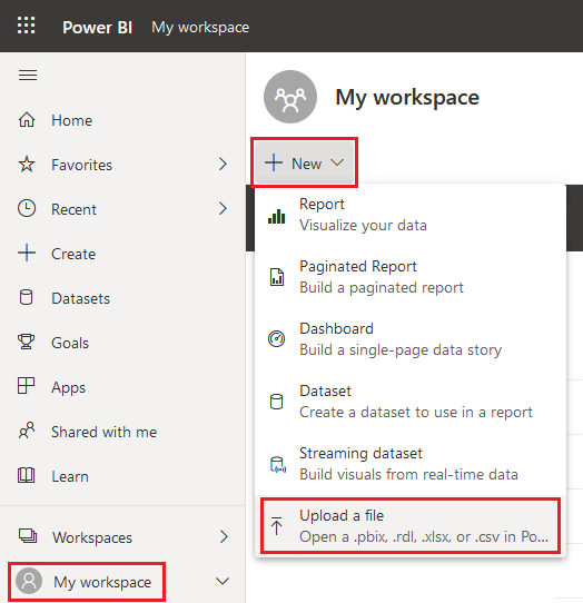 Navigate to My workspace in Power BI Service and select New, then Upload a file. Choose your .pbix report file. Your workspace should now have three new items: