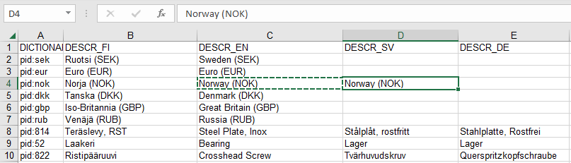 Note: When making changes to the XLS file, do not modify the DICTIONARYID column.