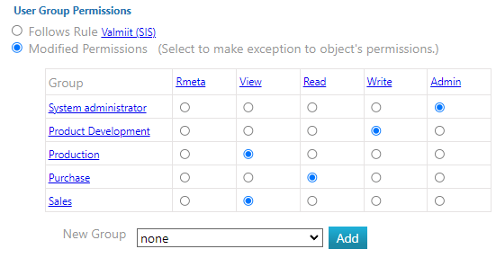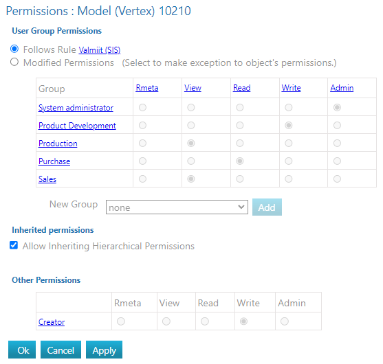 As a rule, you don't need to modify the permissions table because the object's permissions are determined by the permission rules. An exception to this is the inheritance of project or configuration permissions.