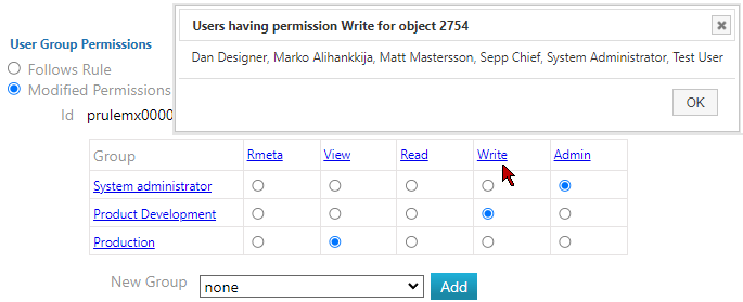 In the lowest "Other Permissions" table, it is stated that the creator of the model always has write access to the object, regardless of whether they belong to the System Administrator or Product Development groups.