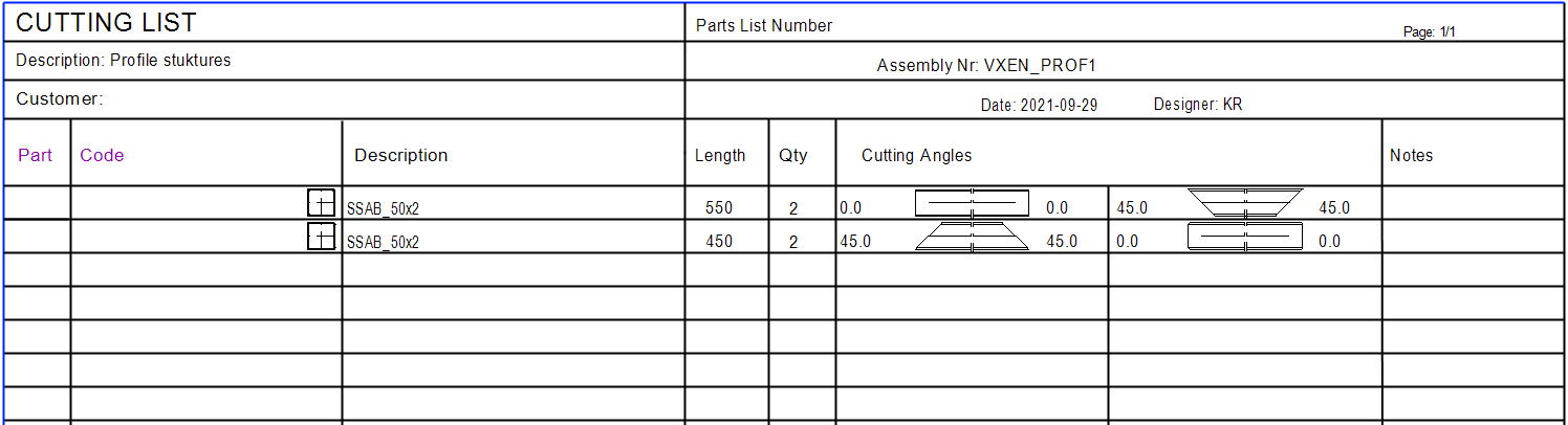 A list of parts is printed on the drawing, which includes the profile lengths in the Amount field.