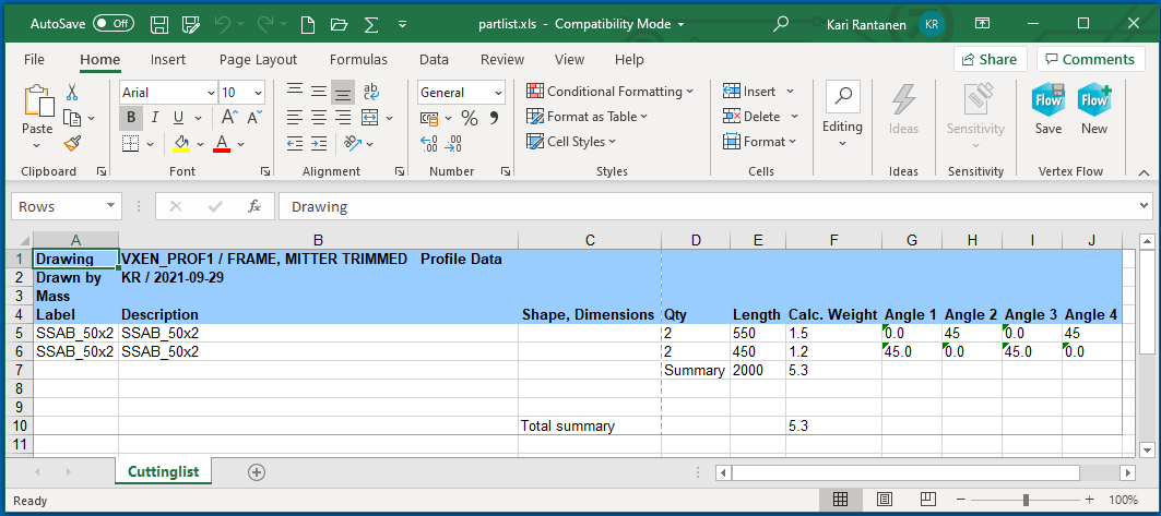The program generates a cutting list to a new Vertex drawing that you can print.