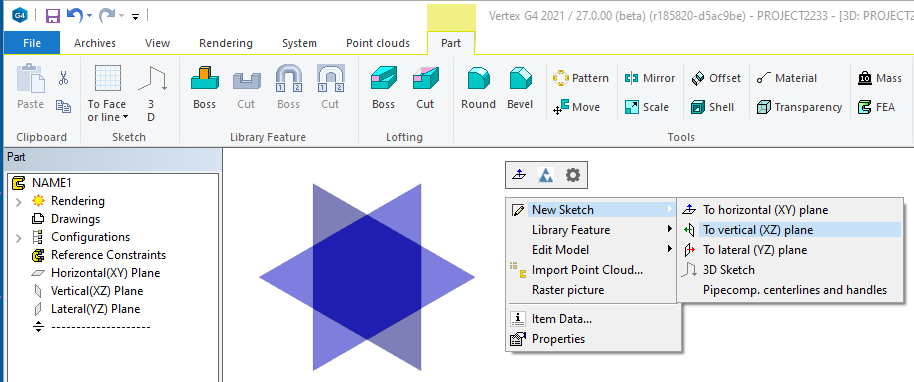 Create a new part with archive data and sketch the first feature.