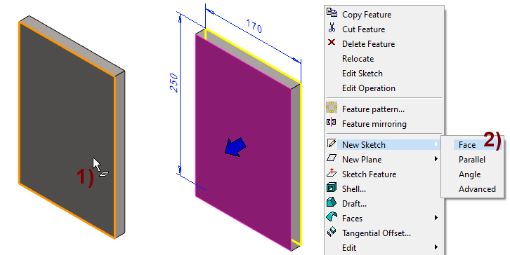 Right-click function: New Sketch > Face, in the figure 2).