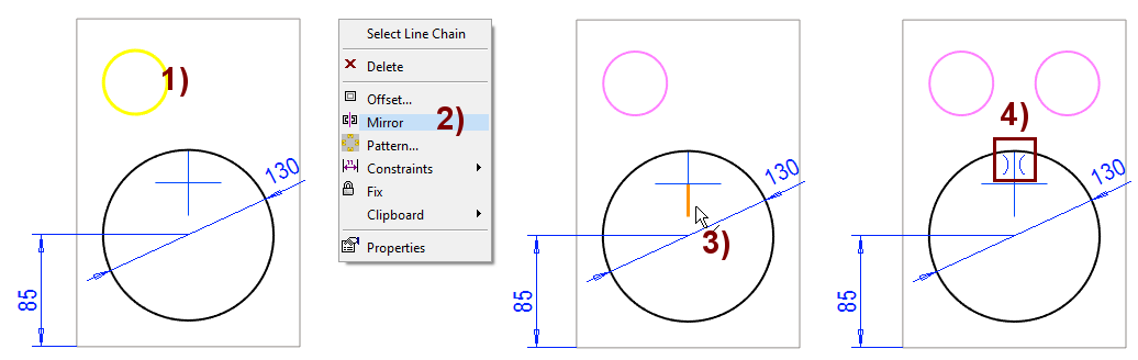The program mirrors the circle and sets the symmetry constraint to it, in the figure 4).