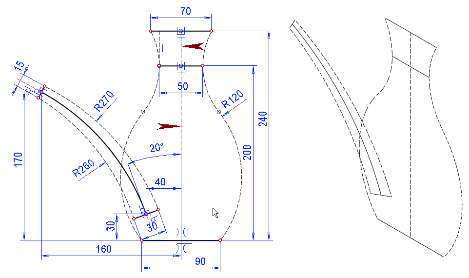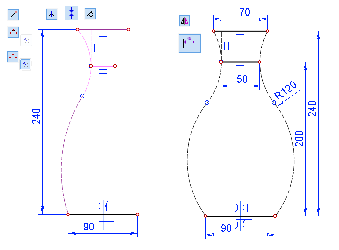 Place the upper arc tangential with the vertical control line (Tangential constraint).