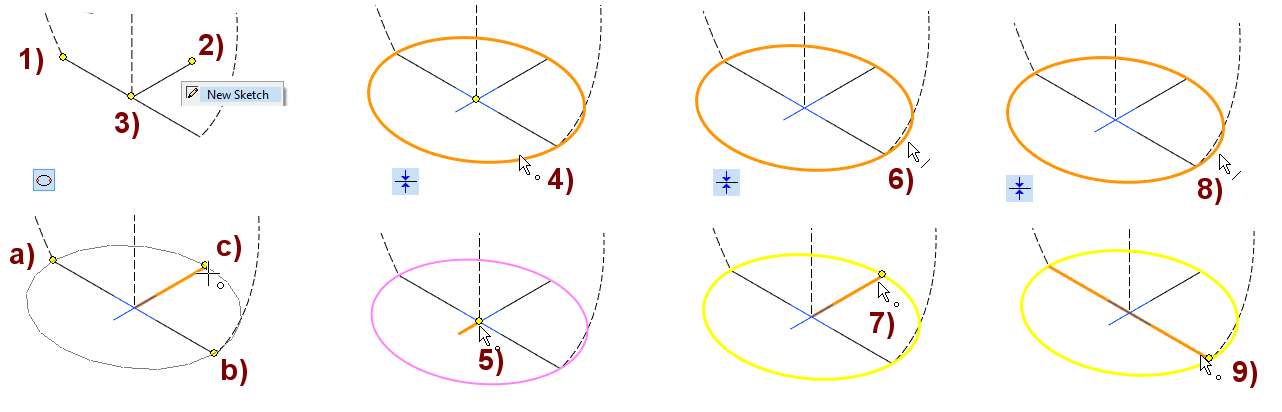 Click the point on the main axis of the ellipse, in the figure a) and b), and then the point defining the width of the ellipse, in the figure c).