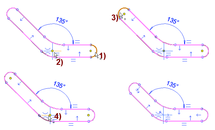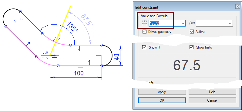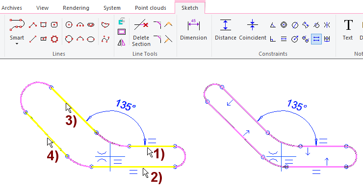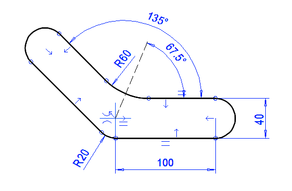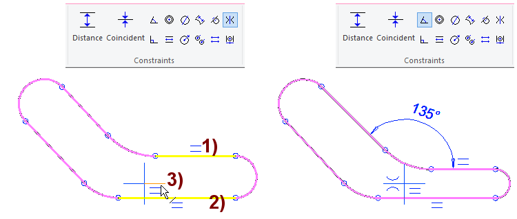As explained in previous exercises, the symmetry and angle constraint can also be started by first selecting two lines (the latter with the Ctrl key pressed).