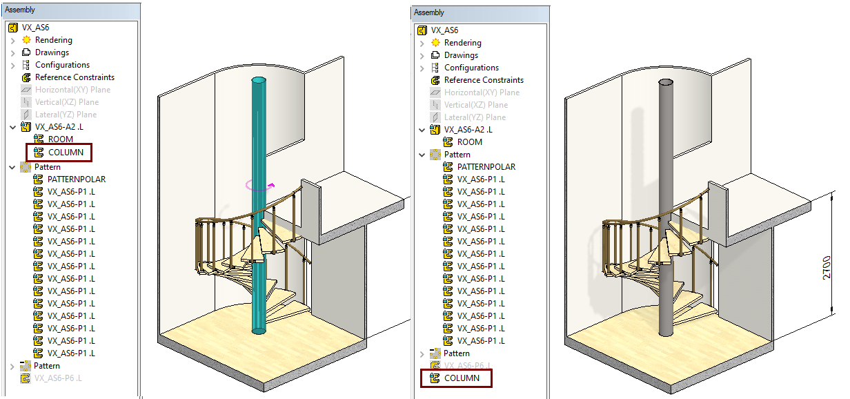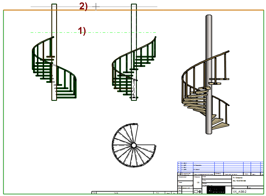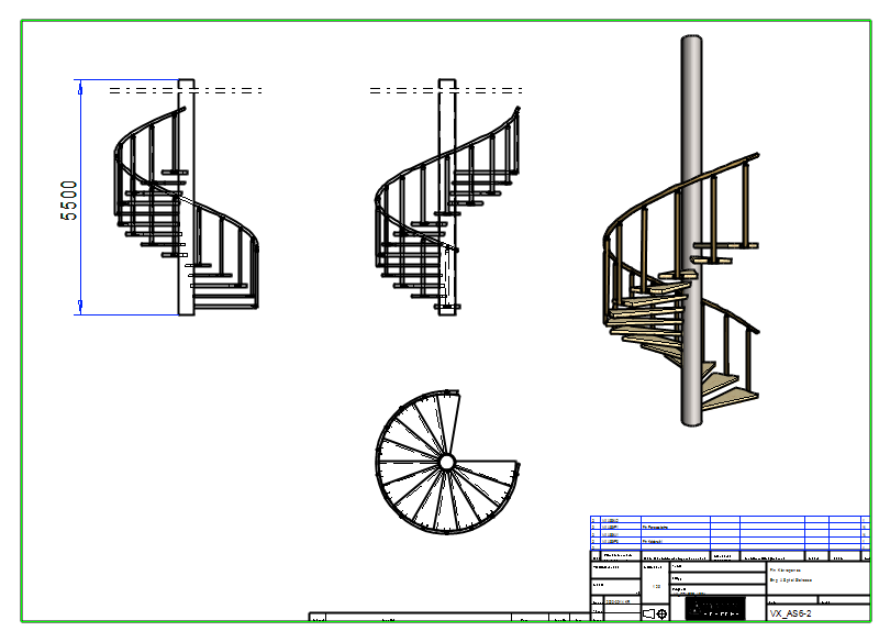 The spiral-shaped handrail is modeled by drawing auxiliary geometries. You can look the model by reading the model VX_AS6-P6.