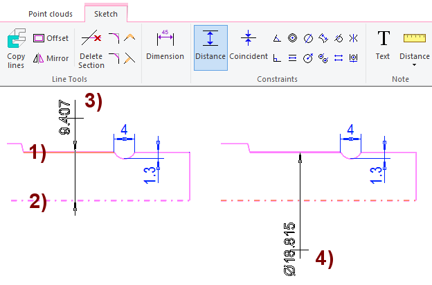 If the cursor is on the same side as the Shape line, the program suggests a line spacing (radius), in the figure 3).