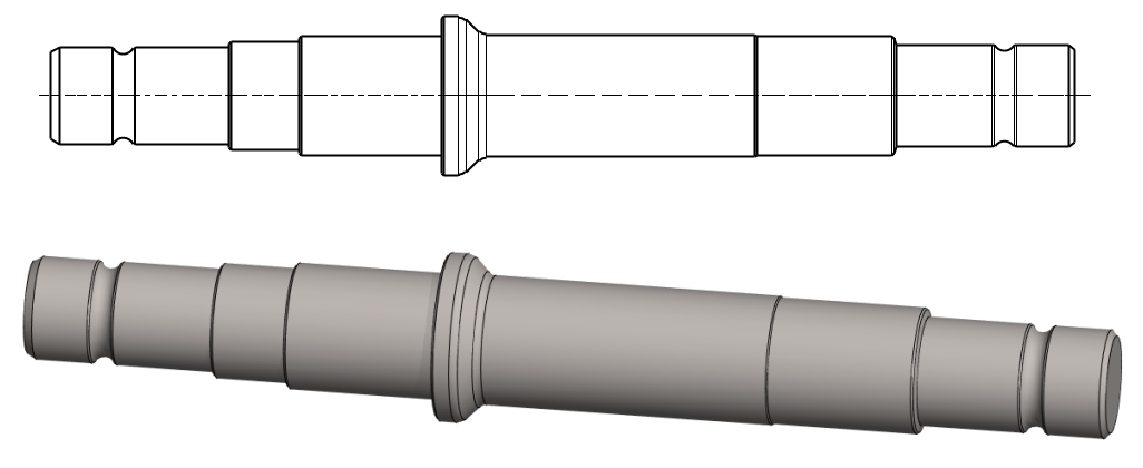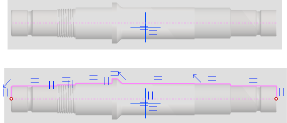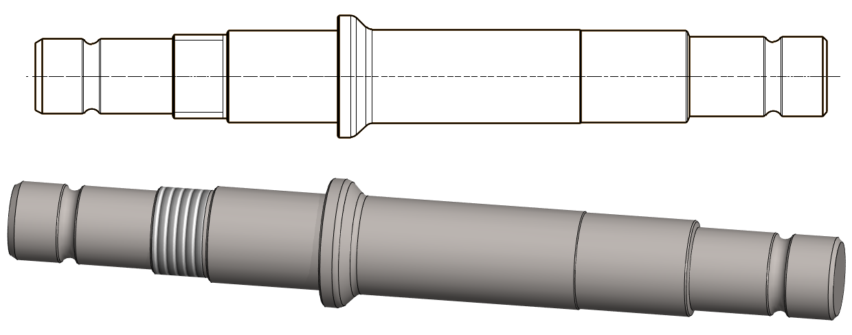 The thread mark appears in the model as a surface texture, but in the model drawing it appears as a thread.