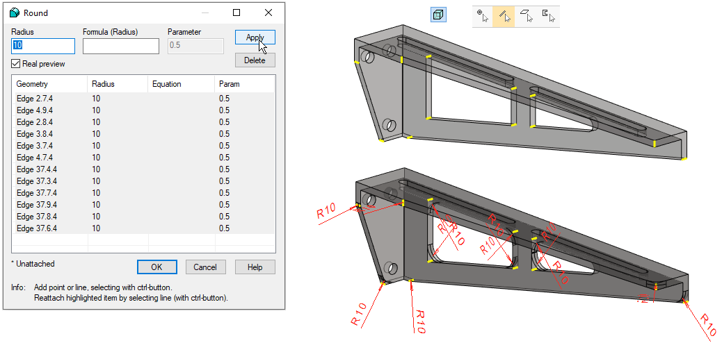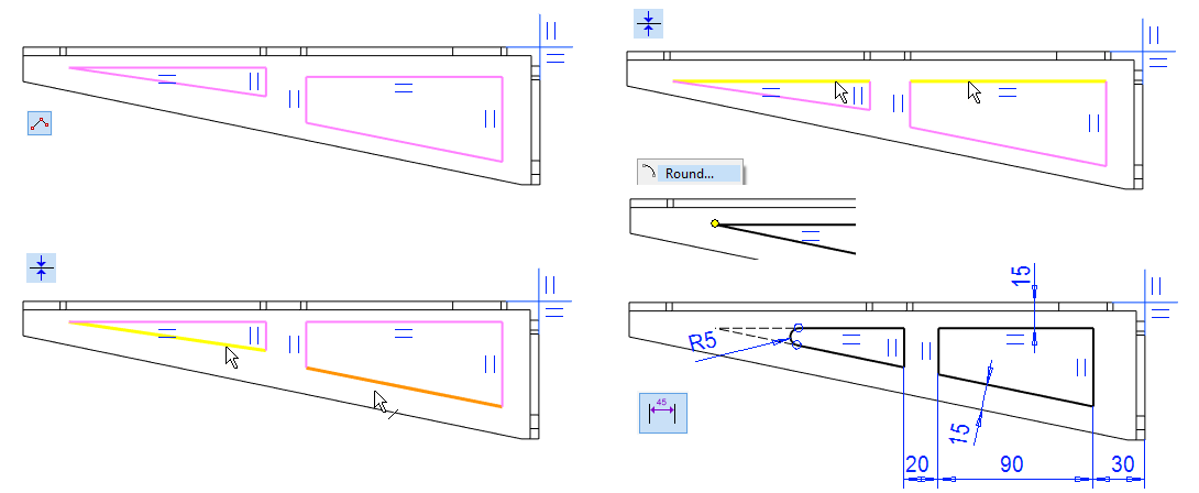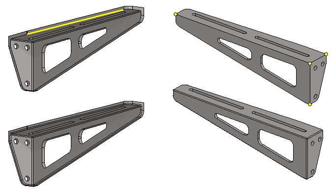 With the help of the guide line, you can control the shape so that the rounding added to the part is at a constant distance from the mounting hole.