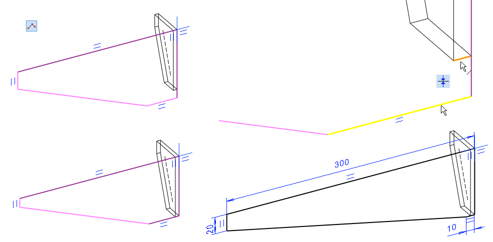 Add a coincident constraint to the top lines (yellow lines) and bottom lines (yellow and orange line).
