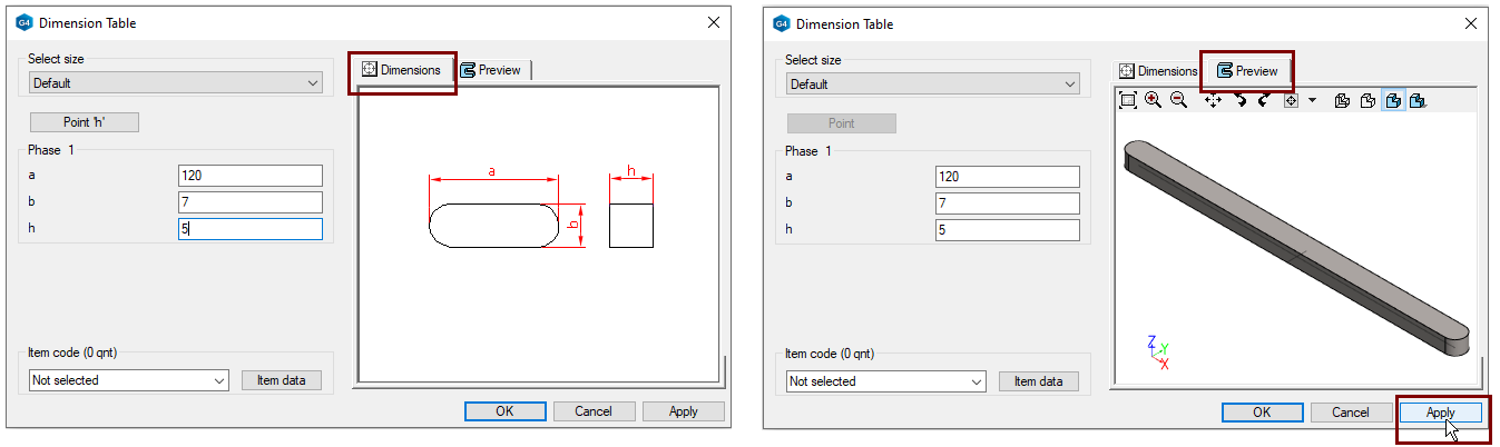 The Previewtab displays the geometry varied to the given dimensions (Use the Apply). In this window, the model can also be zoomed in and viewed from different directions and visualized in different ways.
