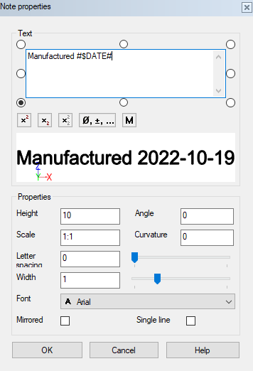 Now it is possible to use Vertex text macros like $DATE, $TIME, MODREG.MOD_ID between two # -signs. Tha way you can easily add a modelling date or customer model id to a sheet metal plate.