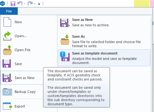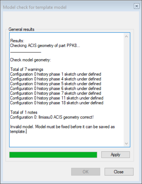 Before saving the model to the library, a geometry check is performed. If the geometry is already defective at this stage or if there are faulty conditions in the assembly, the model cannot be saved. This is done to prevent starting with a defective situation when using the template document. If the check is successful, the document is saved as a new template document.