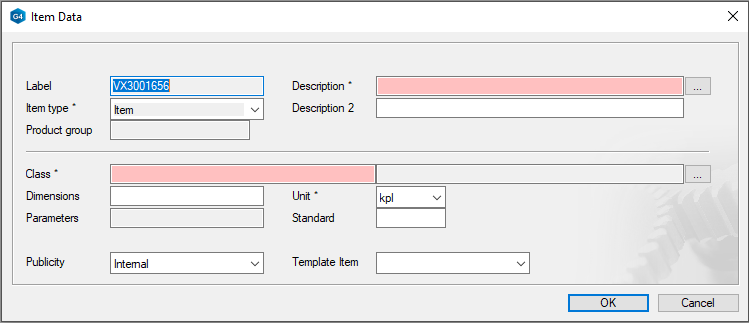 - The item card appears in Vertex G4 when you create a new item and associated model or drawing.