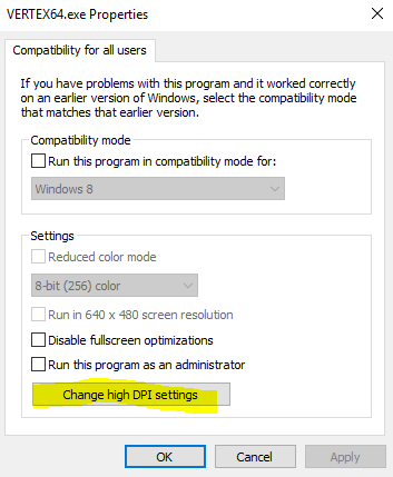 Valitse avautuvasta dialogista Change high DPI settings: