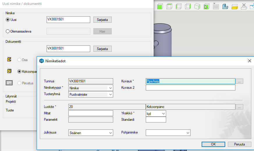 Kun tuodaan G4:ään toisesta järjestelmästä .SAT tai .STP muotoisia kokoonpanoja, ne sisältävät PART tai .imported -alkuisia aliosia. Näille aliosille ei pääsääntöisesti haluta syntyvän nimikettä Flow'hun. Kun tallennat kokoonpanon Flow'hun alla olevan ohjeen mukaan, vain pääkokoonpanolle syntyy nimike. Aliosat jäävät kokoonpanoon paikallisiksi osiksi. Ne voidaan toki tallentaa jälkeenpäin linkkiosiksi ja nimikkeiksi Flow'hin.