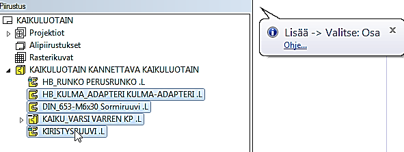 Ohjelma lisää piilotettavat osat listaan.