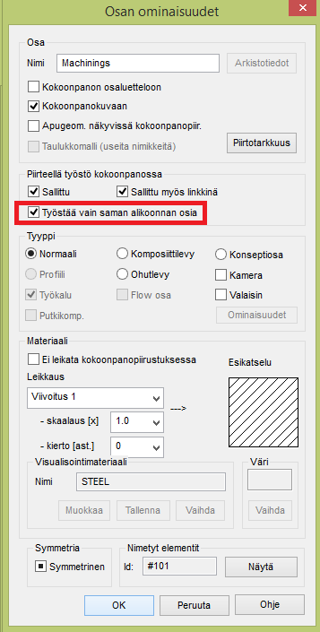 Jotta koneistukset kohdistuisivat vain tähän kokoonpanoon, aseta koneistaville osille ominaisuus: