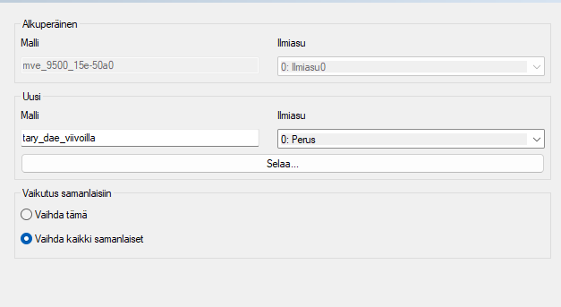 Vaihda kaikki samanlaiset-valinta, jos samoja malleja on monta kokoonpanossa.