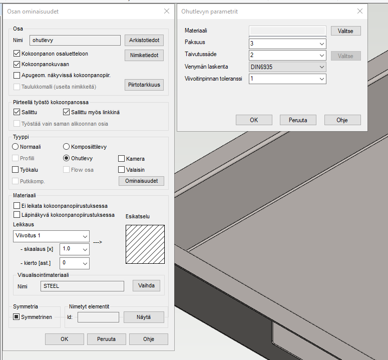 - Varmista, että ohutlevyn ominaisuuksissa paksuus on oikein. Mikäli kappaleen pursotus on tehty muuhun suuntaan kuin levyn paksuuden suuntaan, ei tule käyttää ohutlevyn paksuutena pursotuksen pituutta ohjelman niin kysyessä. Ongelman voi korjata vaihtamalla osan tyypin tavalliseksi ja tämän jälkeen takaisin ohutlevyksi. Tällöin ohjelma kysyy uudelleen osan paksuuteen liittyvät asiat