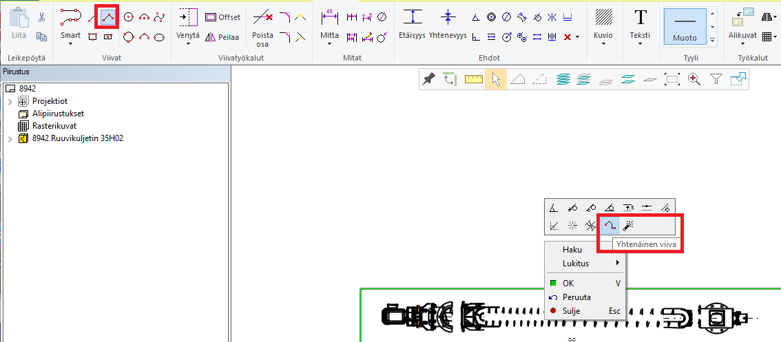 Jos viiva on jo tehty, sen saa muutetuksi yhtenäiseksi toiminnolla "Yhdistä"