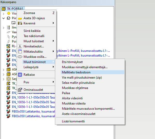 Mallitieto tiedostoon- toiminto löytyy hiiren oikealla kokoonpanopuun ylintä riviä (kokoonpanon nimeä) klikkaamalla: