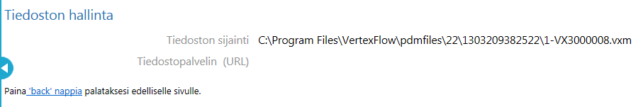 Flow -järjestelmässä tiedoston eteen lisätään revisiotunnus, sitä ei kuitenkaan käytetä liitettäessä tiedostoa dokumenttikortille: 1-VX3000008.vxm > VX3000008.vxm