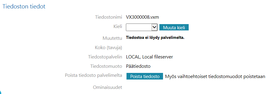 Tilanne, että tiedosto on tallessa Flow -järjestelmässä, mutta linkki dokumenttikorttiin puuttuu. Tällöin Koko -sarake on tyhjä.Tiedostoa voi etsiä Flow -järjestelmästa ja mikäli tiedosto löytyy, sen voi liittää dokumentin metatietoihin. Pahimmassa tapauksessa tiedostoa ei enää löydy Flow -järjestelmästä, vaan se on haettava varmuuskopiomedialta.