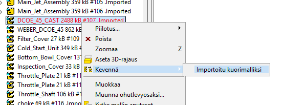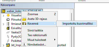 Valitse piirrepuusta mallin ylin taso ja hiiren oikealla näppäimellä "Kevennä - Importoitu kuorimalliksi"
