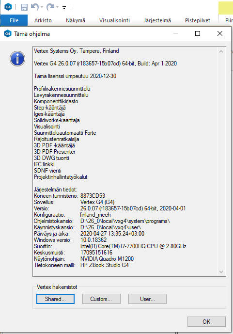 Avainsanat: ohjelmaversio, lisenssi, optio, järjestelmä, hakemisto, kotihakemisto, shared, custom, user, G4, HASP, NetVID, lisenssipalvelin, näytönohjain, tunnistenumero